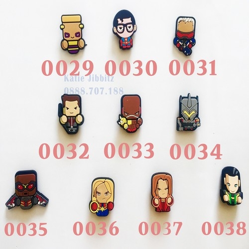 - Nút sticker Jibbitz siêu nhân, siêu anh hùng Marvel, nhóm nhạc BTS