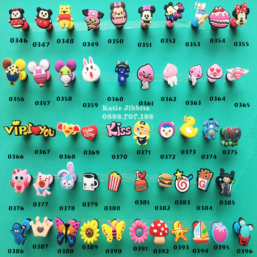 mẫu sticker gắn giày dép Crocs Jibbitz trong album các loại nút có sẵn tại cửa hàng, như: