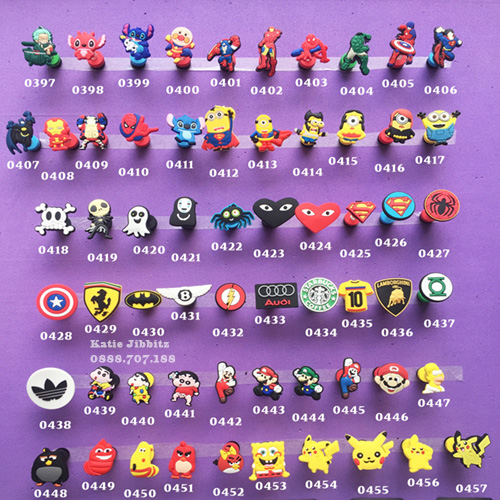 mẫu sticker gắn giày dép Crocs Jibbitz trong album các loại nút có sẵn tại cửa hàng, như: