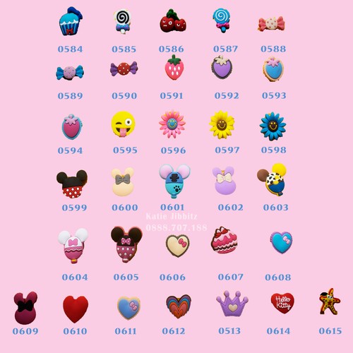mẫu sticker gắn giày dép Crocs Jibbitz trong album các loại nút có sẵn tại cửa hàng, như: