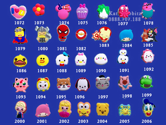 mẫu sticker gắn giày dép Crocs Jibbitz trong album các loại nút có sẵn tại cửa hàng, như: